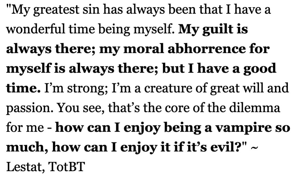 Warning, not a content warning an idea has only as much power over you as you permit it to, none of these ideas alone can harm you unless you give them that power, however, for those of the faint of heart I will be discussing: Catholicism, catholic guilt, PTSD (fictional and otherwise), CSA/SA (fictional and otherwise) the process by which humans other one another and the harm it does to those deemed ‘other,’ history, historiography (European and global majority meaning Jewish and BIPOC), the Haitian Revolution, the French Revolution’s reign of terror and the man made ignorance compounding the logic of guillotine and for that matter any state sanctioned death penalty or murder, vampiric or otherwise. Historical and present violence against women, misogyny, gender roles, biphobia (bisexual erasure, transphobia, monosexim, binarism), philosophy, existentialism, nihilism, hedonism, BDSM/kink culture, as I am a goyim and keenly aware my privilege being a goy, as was our late great Lady Anne Rice, antisemitism, in passing and with respect to its at least 6 million Jewish victims, the Spanish Inquisition, empire as exemplified by the ancient Romans, the Ottomans and Europeans globally but especially the French and English, and most crucially the imperative of being yourself and the necessity of chasing down the dark so you may remember your own inner light.